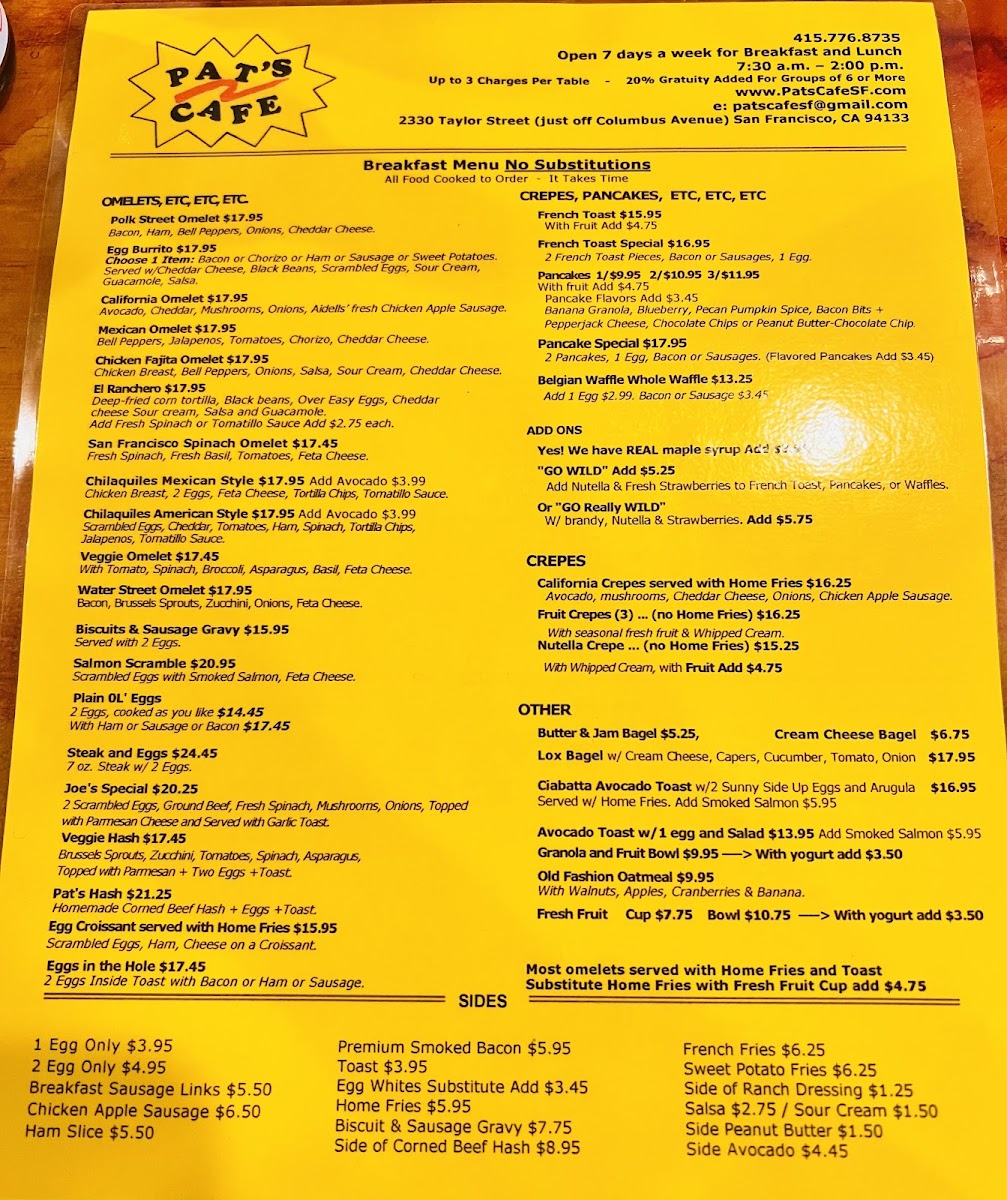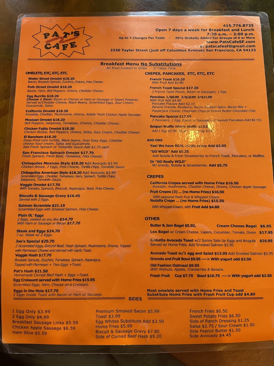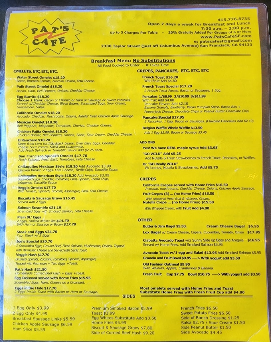 At Pat's Cafe Menu, you'll find a delightful array of comforting and flavorful dishes perfect for any time of day. Located in the heart of San Francisco, just off Taylor Street, this cozy spot brings you a menu filled with classic American favorites and irresistible house specials. Whether you're craving a hearty breakfast to start your day or a delicious lunch to refuel, Pat’s Cafe has something to satisfy your appetite.