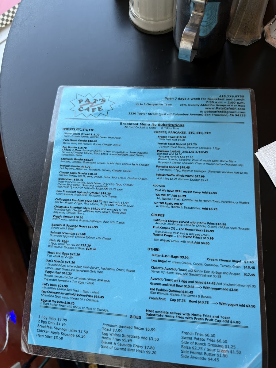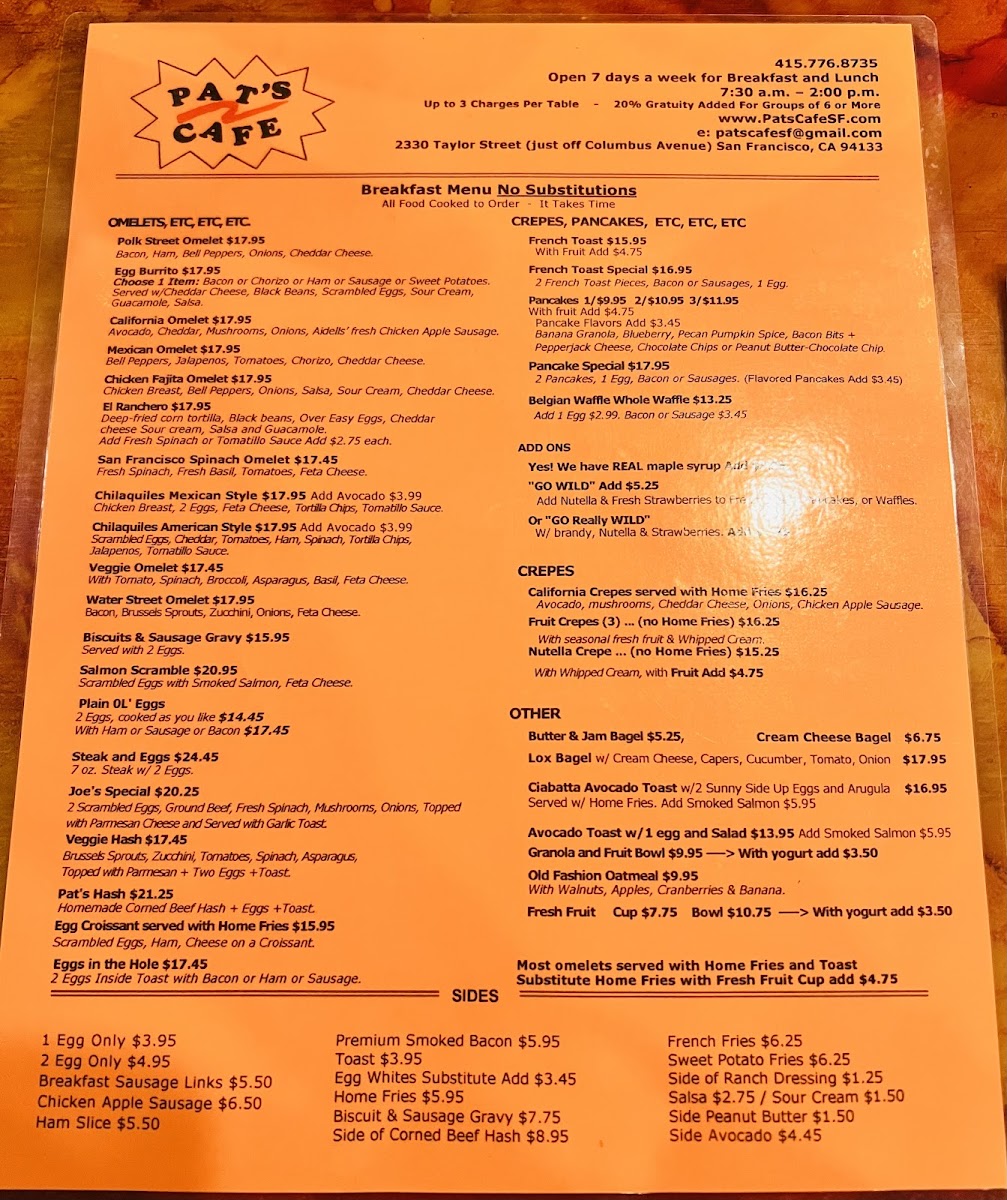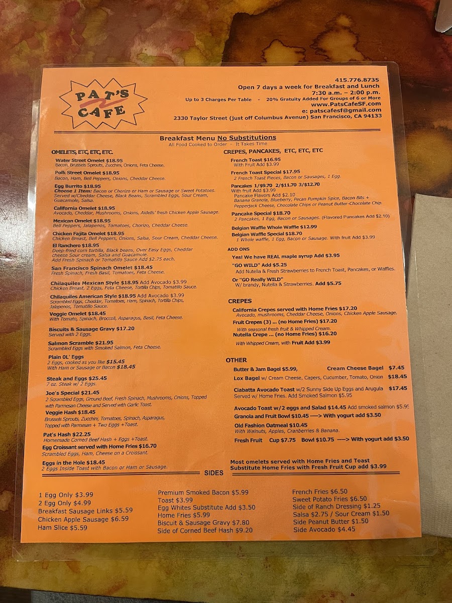At Pat's Cafe Menu, you'll find a delightful array of comforting and flavorful dishes perfect for any time of day. Located in the heart of San Francisco, just off Taylor Street, this cozy spot brings you a menu filled with classic American favorites and irresistible house specials. Whether you're craving a hearty breakfast to start your day or a delicious lunch to refuel, Pat’s Cafe has something to satisfy your appetite.